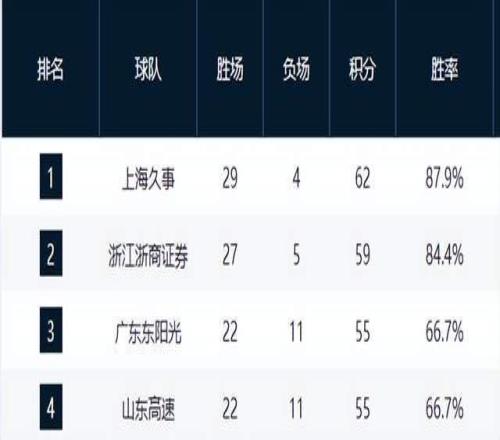 山东队则在主场以胜利反超北京,以22胜11负的战绩升至第4位,与广东队战绩持平,但因相互交锋劣势暂居其后。广东队虽仍稳居第3(22胜11负),但身后山东、深圳(21胜11负,少赛一场)虎视眈眈,且球队接下来还将迎战两场广厦,保三压力陡增。
