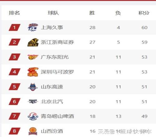 而北京队则略为尴尬,在广东队和深圳队相继赢球后,由于球队与山东队交锋上的劣势,北京队排名已经从积分榜第三名,下滑到积分榜第6名,积分榜第5名则属于山东队,他们的战绩都是20胜11负。第7名则属于青岛队,他们的战绩为18胜13负。山西队这一轮比赛虽然遗憾输球,不过,凭借着先赛一场的优势,他们还是逆袭杀回前八名,战绩为16胜16负。