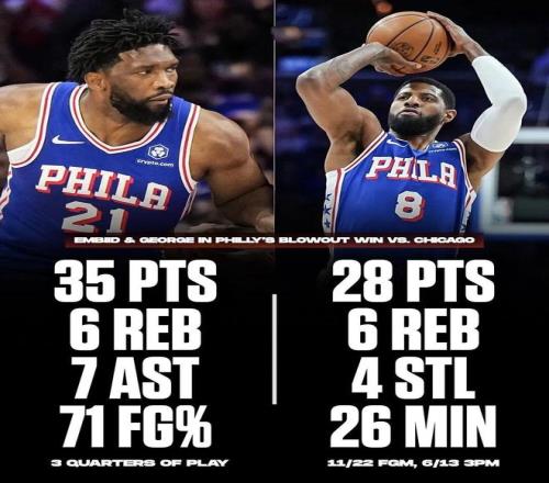 恩比德上一次打球已经是一个月前,保罗乔治则是被禁赛了25场,两人复出第一场就能打出这种表现,必须值得肯定。