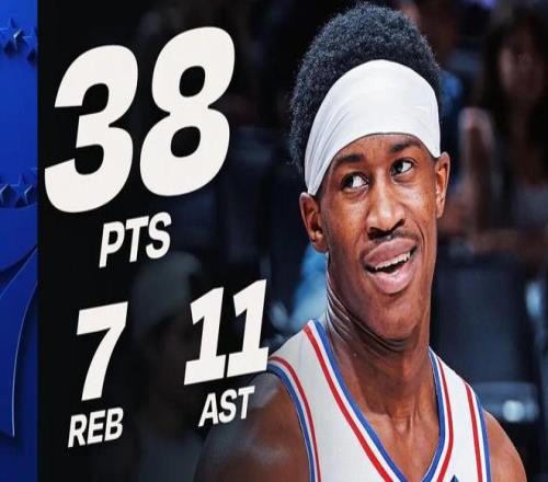 ——对阵国王,投篮28中16,三分7中3,罚球3中3,得到38分7篮板11助攻2抢断,38分是本赛季全部新秀的第三高分(前二都是弗拉格),注意,这场76人赢了21分,埃奇库姆的正负值高达+44