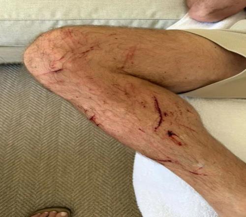希勒骑车时因路面坑洞摔伤,手部和腿部有多处擦伤